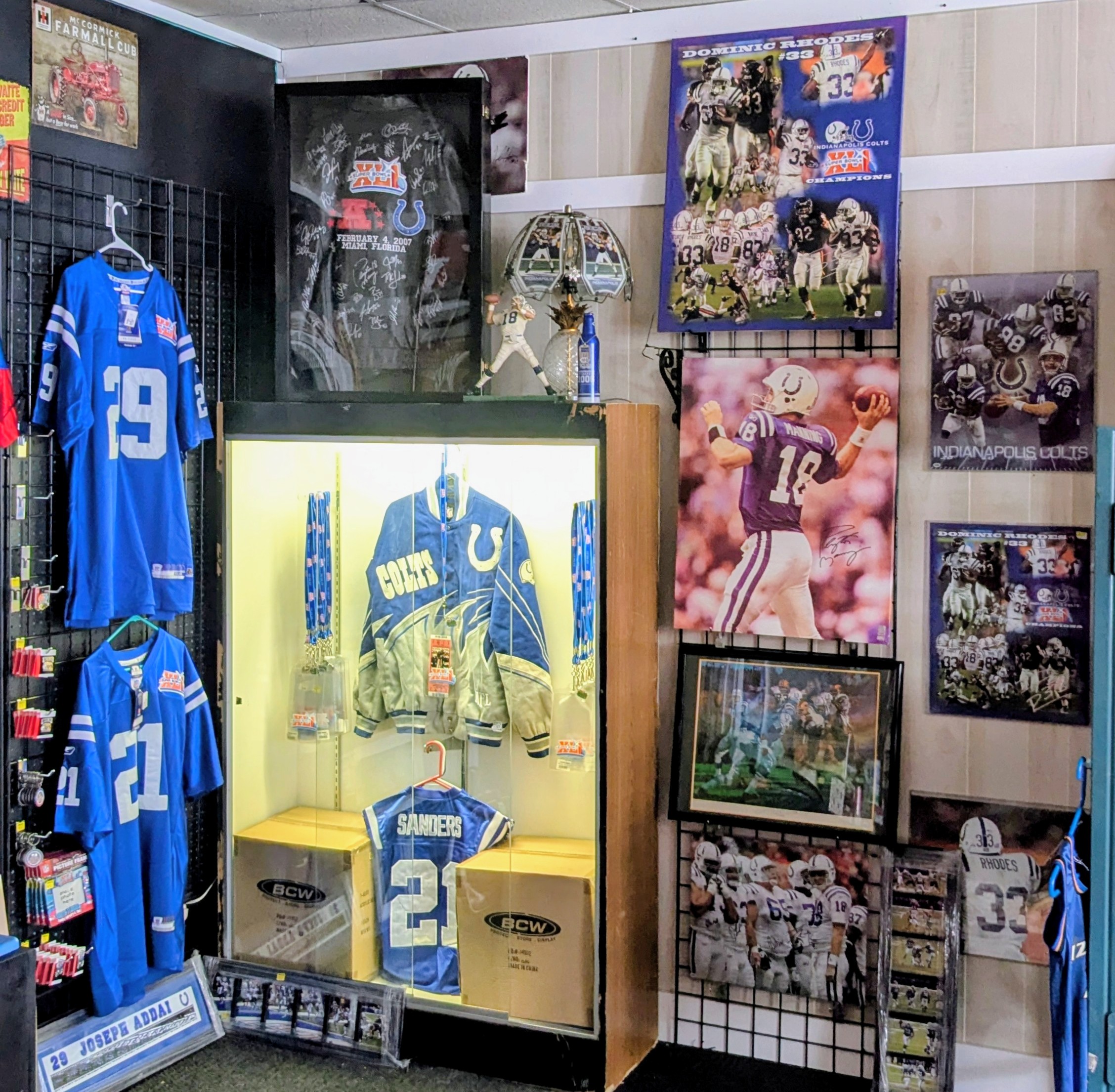 An Indianapolis-focused corner featuring a Super Bowl XLI team-signed leather jacket and a hand numbered, autographed Johnny Unitas lithograph.